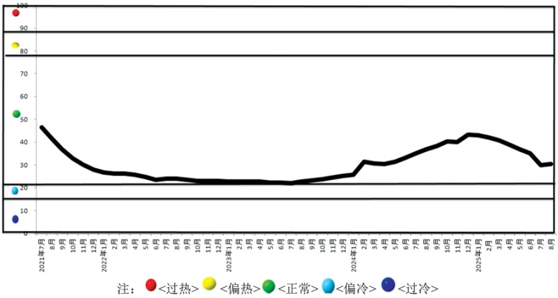 8月份,中国有色金属产业景气指数为30.3,较上月上升0.4个百分点,从总体来看,8月景气指数呈现上升趋势,仍处在 “正常”区间中部。