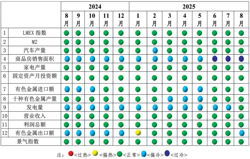 在构成有色金属产业景气指数的12项指标中,LMEX指数、M2、汽车产量、家电产量、有色金属固定资产月投资额、十种有色金属产量、营业收入、发电量、利润总额及有色金属进口额等10项指标位于“正常”区间;有色金属出口额1项指标位于“偏冷”区间;商品房销售面积1项指标位于“过冷”区间。