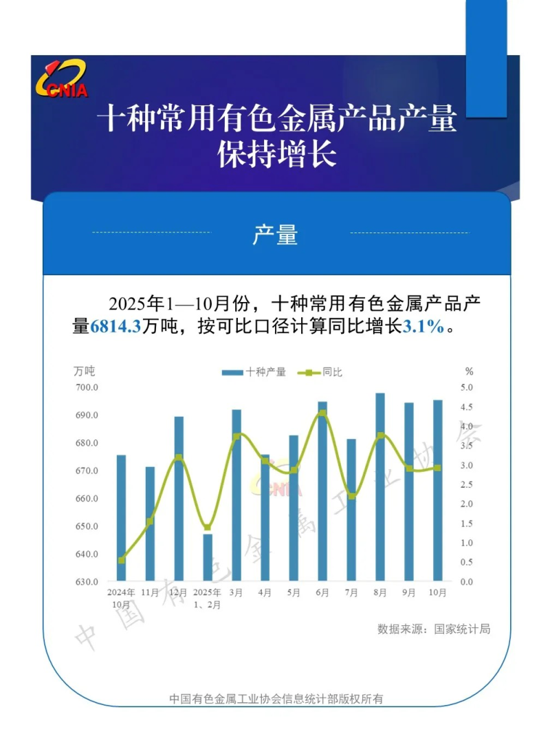 分产品看,10月份,十种有色金属产量695.4万吨,同比增长2.9%,其中,原铝(电解铝)379.8万吨,增长0.4%。1—10月份,十种有色金属产量6814.3万吨,同比增长3.1%,增幅比前三季度扩大0.1个百分点,其中,原铝(电解铝)3775.3万吨,增长2.0%。